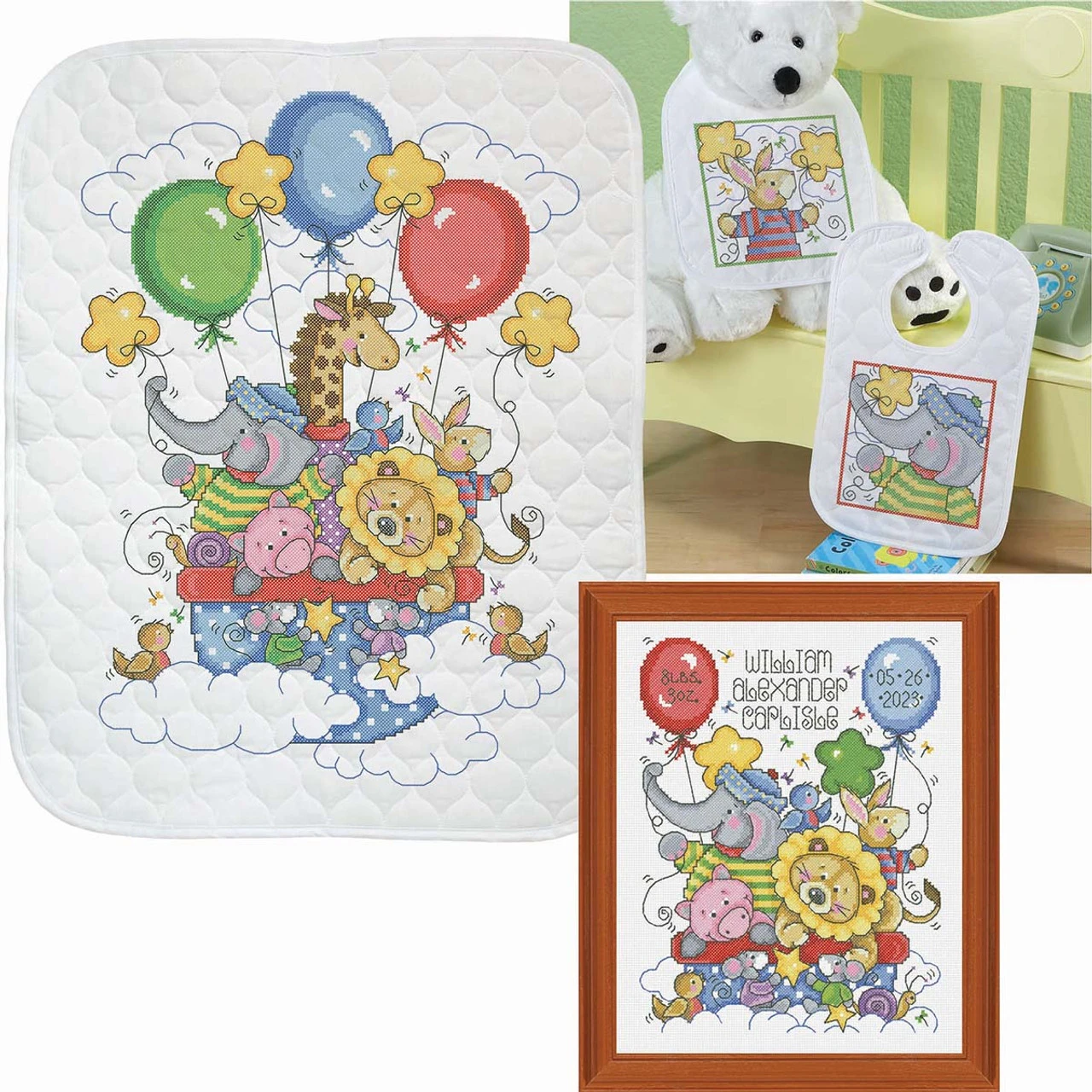 Save when you buy the bundled set with the baby quilt top, baby bibs, and birth record. Favorite animals float off on a balloon adventure in this set of nursery designs. Featuring beloved animals like an elephant, giraffe, lion, pig, rabbit, snail, mice, and birds, this adventurous group rides in a blue polka dot basket carried by bright balloons and yellow stars in this playful design filled with fluffy white clouds. This bundled set helps you create a coordinated nursery with a matching baby quilt, pair of baby bibs, and a birth record. The baby quilt and bibs are stamped for cross-stitch on pre-quilted white polyester/cotton fabric with a bound edge. The bibs have a hook and loop closure. As both are pre-finished and pre-quilted, there are no extra sewing or quilting skills needed. The counted cross-stitch birth record kit includes 14-ct. white aida cloth. All kits include cotton floss, floss organizer, and needle. Made in U.S.A. and imported.