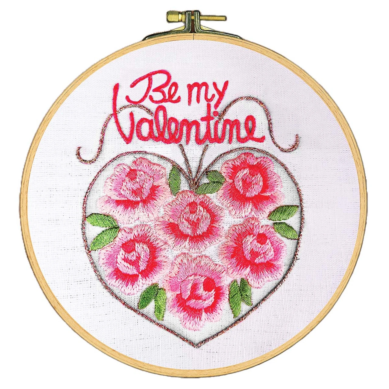 This embroidered valentine features a bouquet of beautiful pink roses arranged in a heart shape with a ribbon border. The words Happy Valentine make this floral design a sweet gift for someone you love. The design is stamped for embroidery on ivory fabric, meaning there is no need to transfer or trace the design. Simply follow the easy-to-read chart and instructions to stitch the design. Kit includes stamped ivory fabric, cotton floss, bamboo hoop, needle, and instructions. The finished design measures 6″ (15.2cm) dia. Imported from Europe