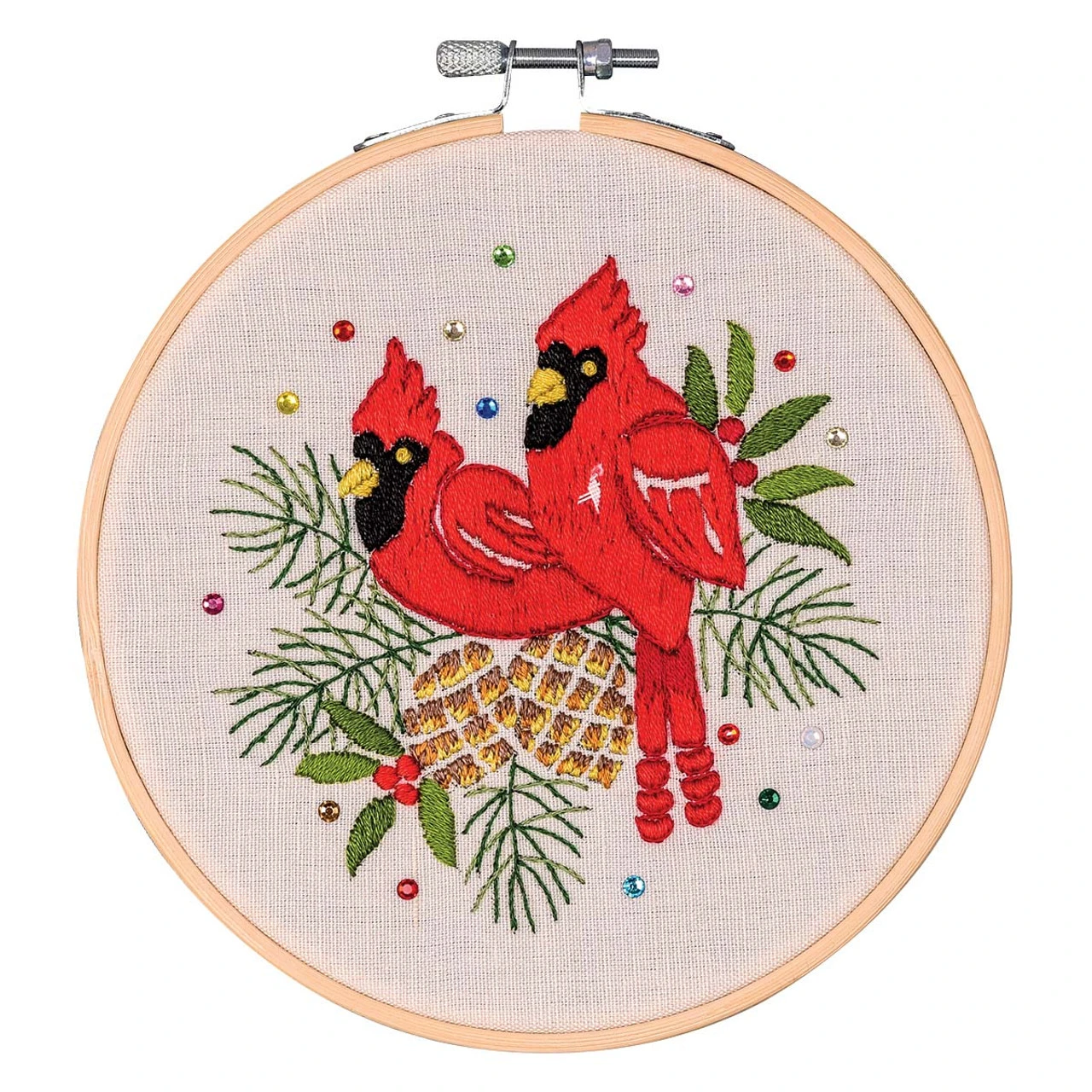 This Christmas embroidery design features a pair of bright red cardinals perched on pine branches with pinecones. Rhinestone embellishments add an extra holiday sparkle to the joyful seasonal image. The design is stamped for embroidery on ivory linen/cotton fabric, meaning there is no need to transfer or trace the design. Simply follow the easy-to-read chart and instructions to stitch the design. Kit includes stamped ivory linen/cotton fabric, cotton floss, rhinestones, bamboo hoop, needle, and instructions. The finished design measures 6″ (15.2cm) dia. Imported from Austria.