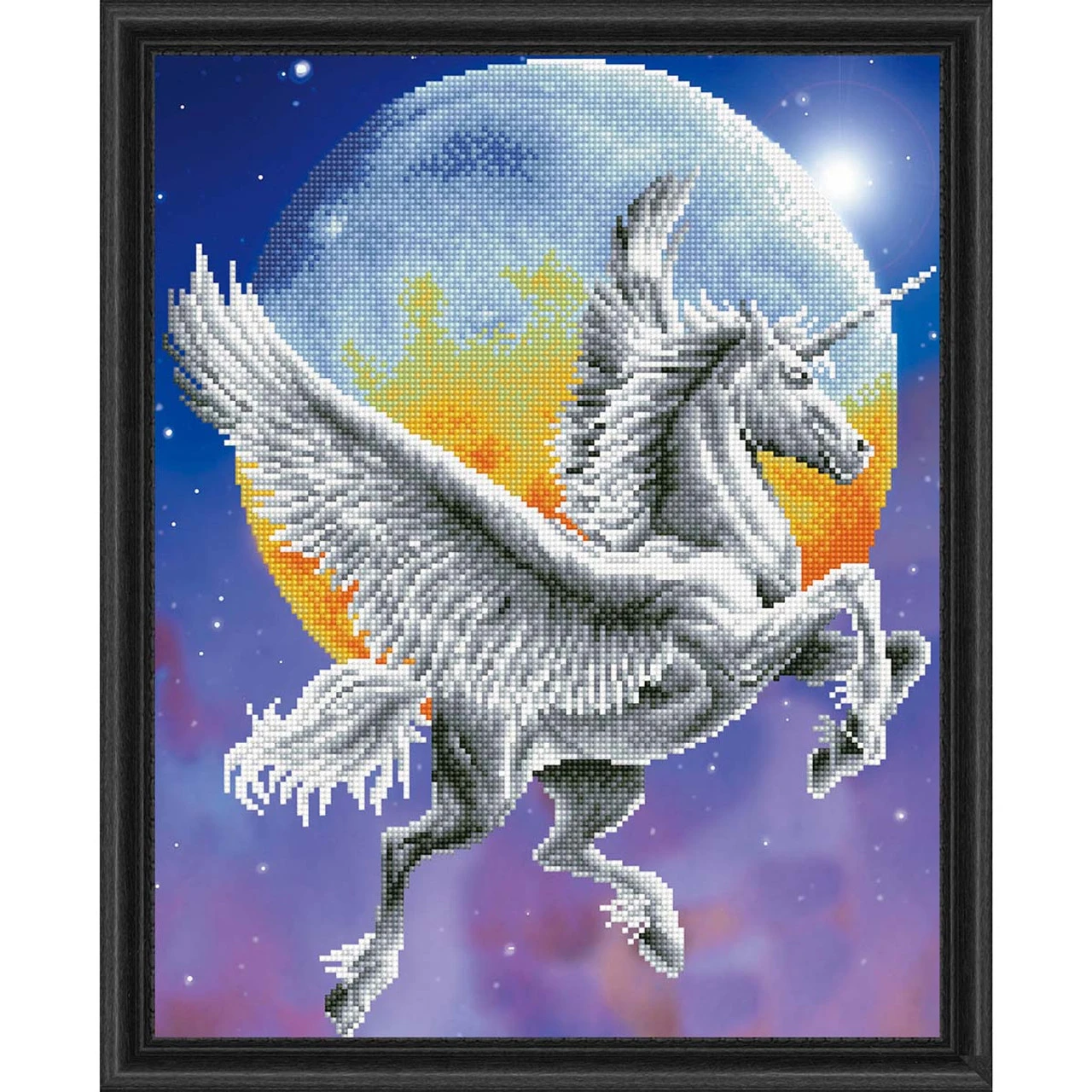 Whimsy takes flight in this glitzy portrait of a magical winged unicorn. Diamond painting kit includes high-quality color-printed fabric, pre-sorted Diamond Dotz, stylus, craft tray, and wax caddy. 20 x 16″ (51 x 41cm).