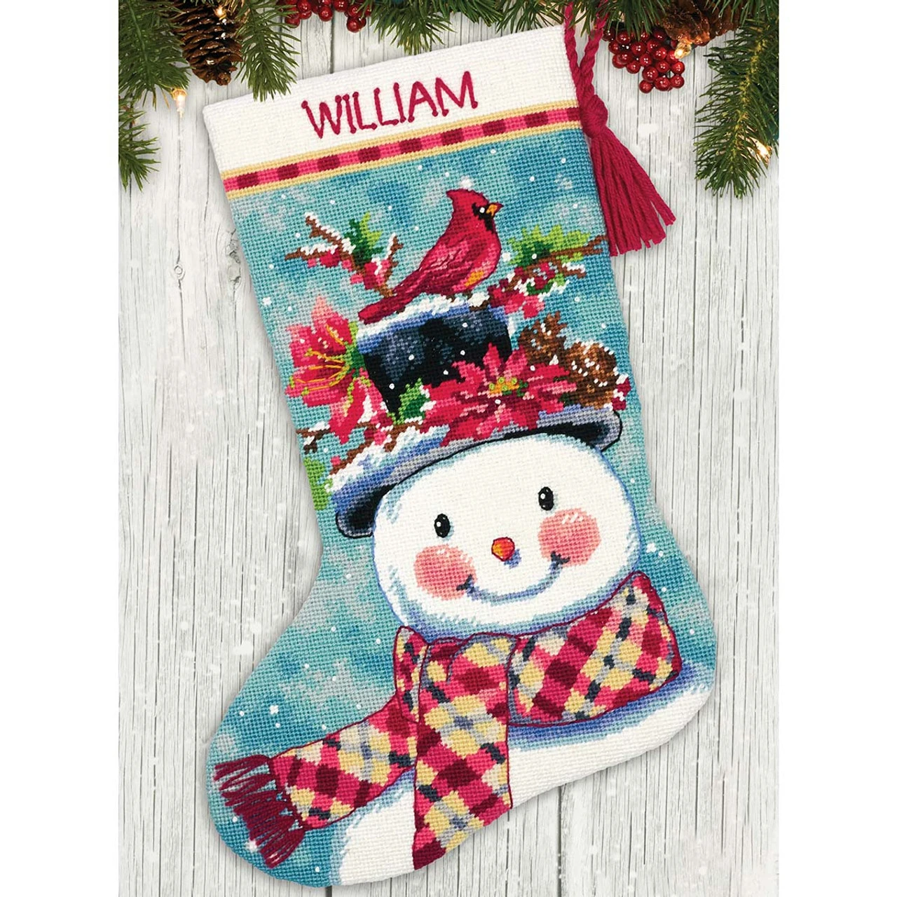This jolly snowman and his feathered friend are ready for your mantel. Needlepoint kit includes 12-mesh printed cotton canvas, acrylic and wool yarns, felt for backing, needle, and directions for personalization. 16″ (41cm) L. Imported.