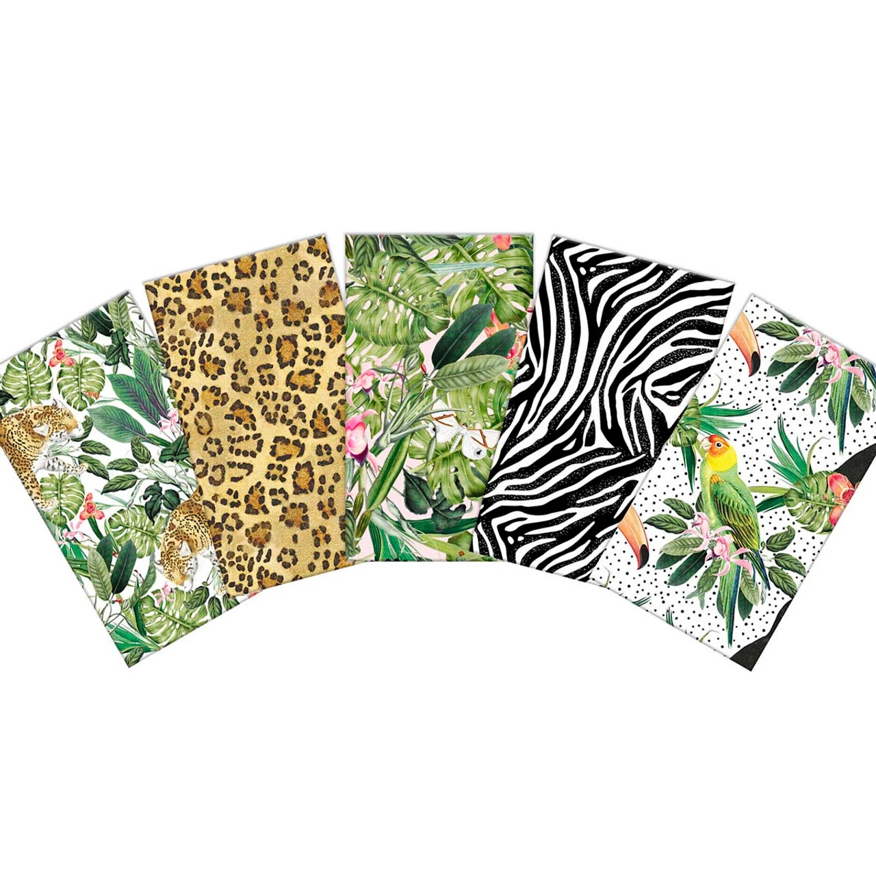 This pre-cut printed cotton fabric collection features 5 fun animal prints inspired by the tropics with leopard print, zebra print, various botanicals, and parrots. The 100% cotton fabric is cut into fat quarter pieces, each measuring 18 x 21″ (46 x 53cm). The collection includes 5 pieces of fabric (1 in each print shown). Imported.
