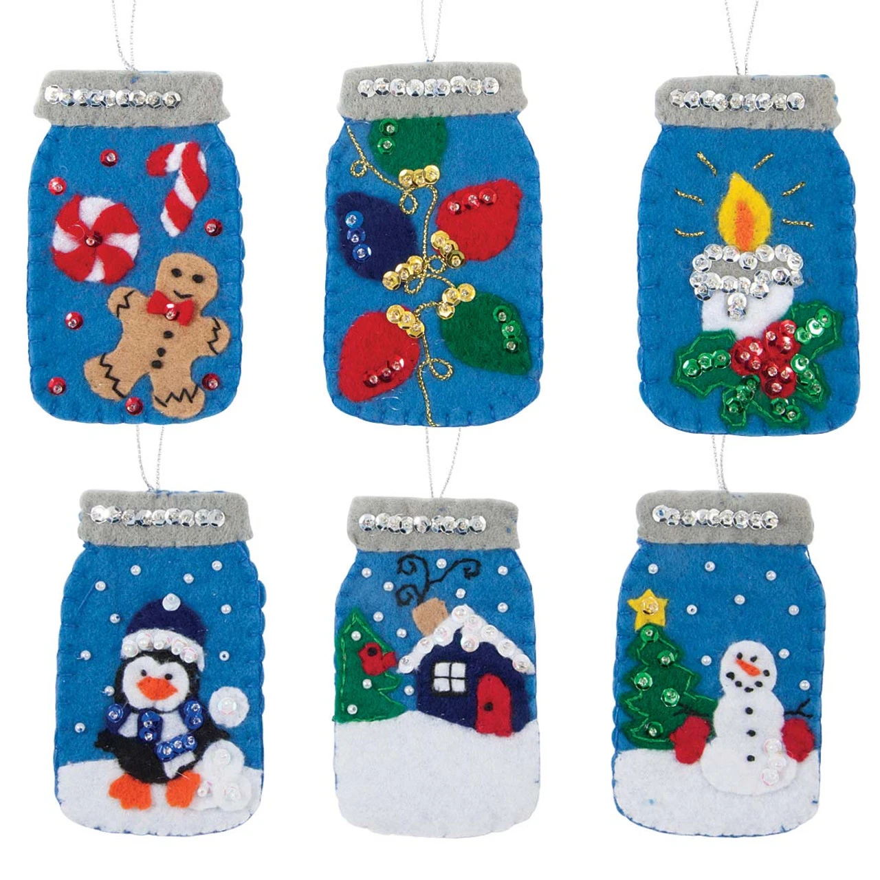 Preserve precious Christmas memories when you deck your tree with trendy felt appliqué ornaments. These fun felt and sequin ornaments feature mason jars filled with merry holiday scenes and joyful symbols of the Christmas season. Designs include a gingerbread man with treats, Christmas lights, a candle, a penguin playing in the snow, a cozy snow-covered cabin, and a jolly snowman with a Christmas tree. Felt and sequin kit includes felt, cotton floss, sequins, beads, cording, needles, and complete instructions with templates and diagrams to complete the set of six ornaments as shown. Stitched in a combination of bright and cheery colors, these ornaments measure 2½ × 4″ (6.4 x 10.2cm). Imported.