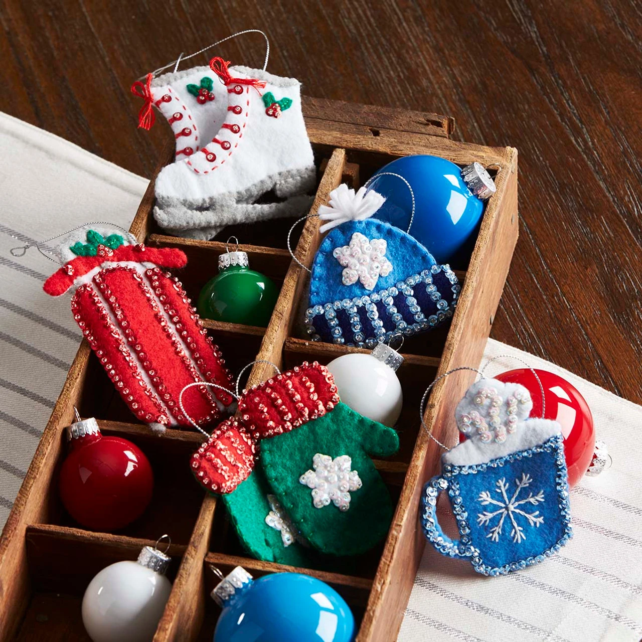 Enjoy frosty outdoor fun with these charming felt and sequin ornaments that capture the spirit of winter days with mittens, a hat, a cocoa mug, ice skates, and a sled accented with snowflakes and boughs of holly. This felt and sequin kit includes felt, cotton floss, sequins, beads, cording, needles, and complete instructions with templates and diagrams to complete the set of seven ornaments as shown. Stitched in a combination of wintry blues and classic red and green colors, these ornaments measure up to 3¼ x 5¼” (8.3 x 13.3cm). Imported.