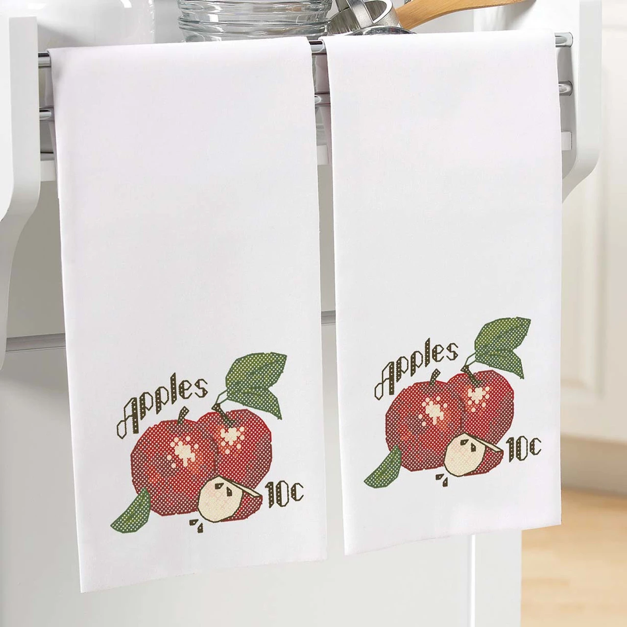 This delightful pair of cross-stitch towels features bright red apples. Inspired by farmers’ markets, the pair brings a sweet taste of nostalgia to your kitchen. These cross-stitch towels are stamped for stitching on white polyester/cotton towels with a perle edge. There are two towels in the set, and each towel is pre-finished and ready for stitching. Simply follow the easy-to-read chart and instructions to stitch the towels. Floss and needle are not included. Each towel measures 19 x 34″ (48 x 86cm). Imported.