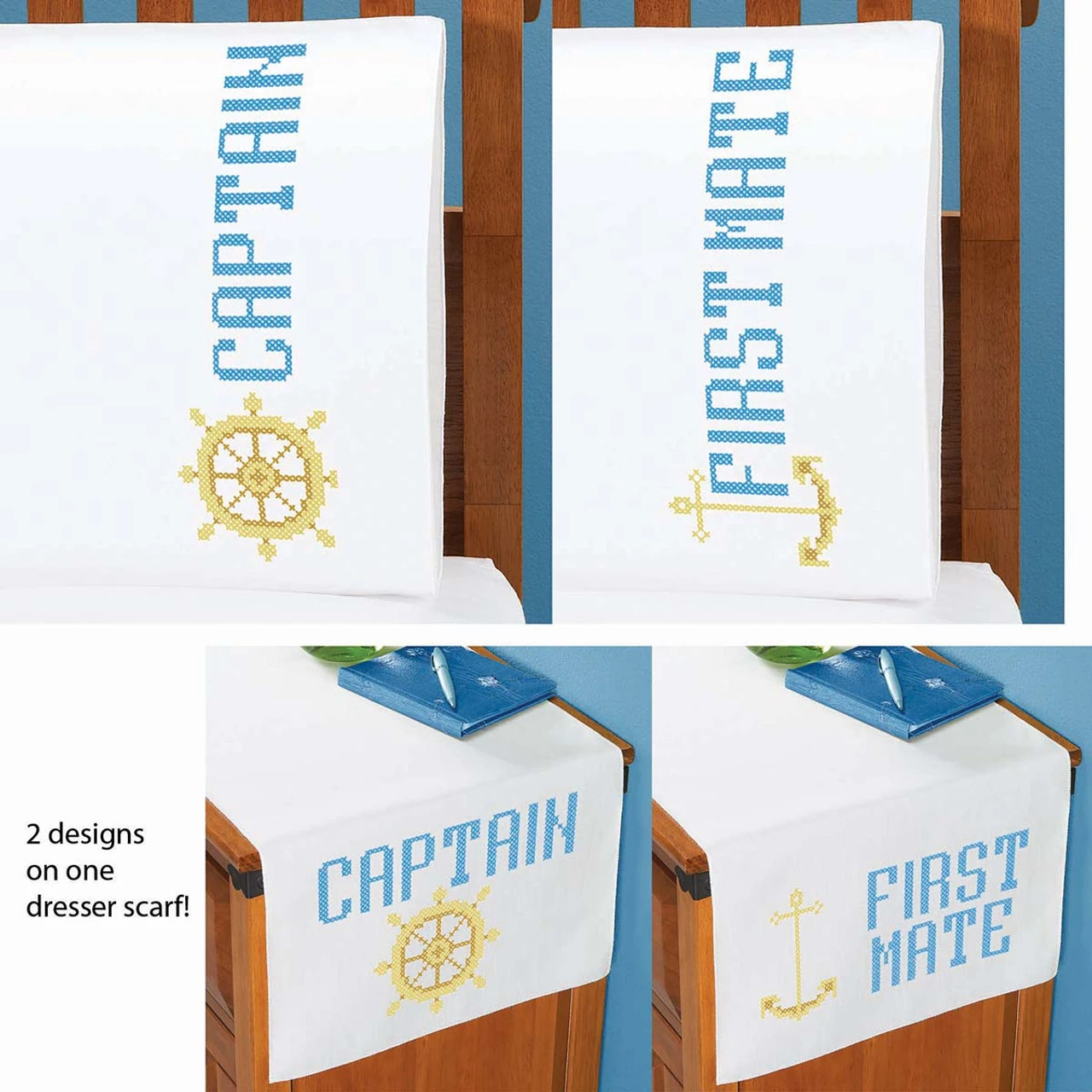 Wish the happy couple smooth sailing with a nautical nod to teamwork. Stamped for cross-stitch on white polyester/cotton fabric with a perle edge. 20 x 30″ (51 x 76cm) pillowcase pair. 14 x 44″ (36 x 112cm) dresser scarf. Imported.
