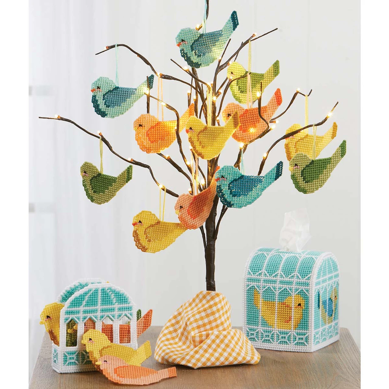 These whimsical plastic canvas designs feature a variety of folk art birds stitched in pastel shades to decorate your home. With coordinating designs for ornaments, coasters, and a tissue box holder, you these songbirds will bring a sense of harmony to your spring and summer decorating. Ornate birdcage designs create a clever place to hold the coaster set and cover your tissues. This complete kit includes 7-mesh plastic canvas, acrylic yarn, needle, and instructions to create a tissue box cover, a set of six coasters with coordinating holder, and a set of 12 ornaments. Imported.