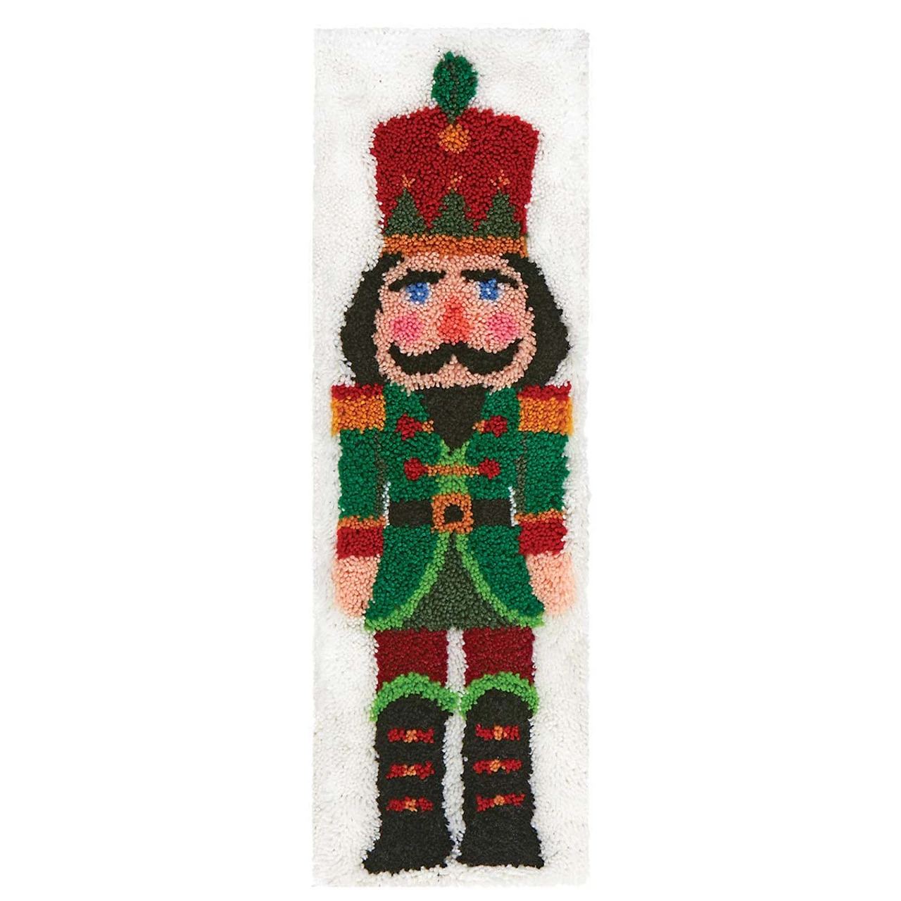 This Christmas latch hook banner features classic holiday nutcracker dressed in red and green. The iconic character from the classic ballet story will stand guard in your Christmas décor and make a beloved guest in your holiday traditions. Kit includes 3.75-mesh gridded canvas, lofty pre-cut 100% acrylic yarn, easy-to-follow chart, and instructions. Latch hook tool and binding not included. The higher-gauge canvas of this project allows for a high level of detail in the finished design. The finished banner measures 12 x 40″ (24 x 102cm). Imported.