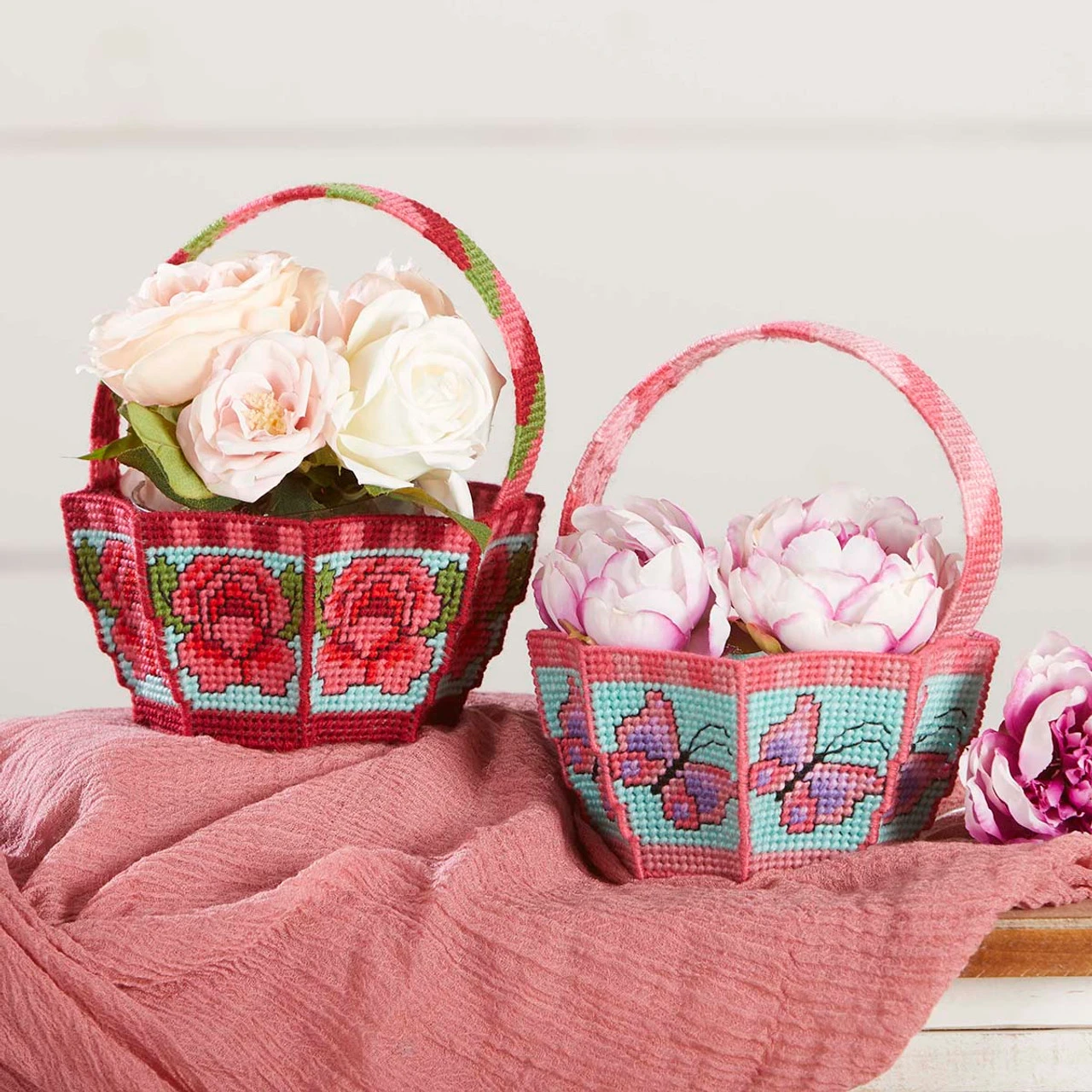 Serve up summer treats in darling hand-stitched baskets. These adorable plastic canvas basket designs feature pink and purple butterflies or beautiful red roses. Each is adorned with a coordinating striped handle to create a cute and colorful centerpiece for a brunch table or a summer picnic. The kit includes 7-mesh plastic canvas, acrylic yarn, needle, and complete instructions. Contents not included. Baskets measure 7 x 9″ (17.8 x 22.9cm) each. Imported.