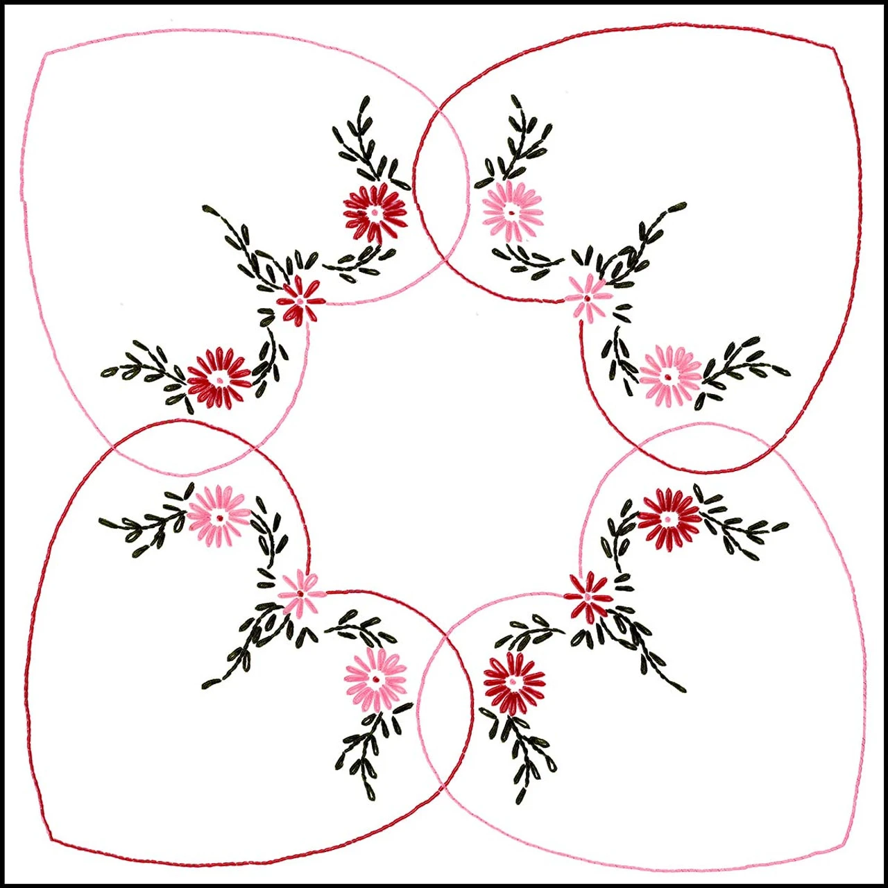 • This pre-finished pillow cover is ready for stitching with four hearts arranged to create large flower petals embellished with little pink and red blossoms with green leaves.