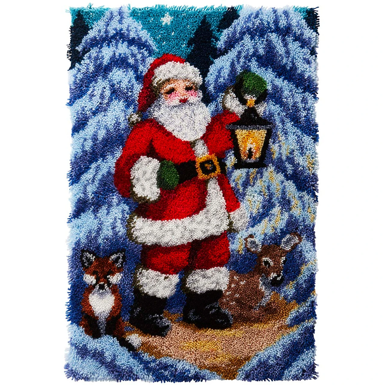 Let Santa guide the way to a merry holiday in this enchanting woodland scene. Crafters of all ages and skill levels enjoy the variety latch hook provides. Finished projects can be made into pillows, wall hangings, rugs, and more. Kit includes 3.75-mesh gridded canvas, lofty pre-cut 100% acrylic yarn, clear vinyl storage bag, easy-to-follow chart, and instructions. Latch hook tool not included. The higher-gauge canvas of this project allows for a high level of detail in the finished design. 27 x 40″ (69 x 102cm). Imported.