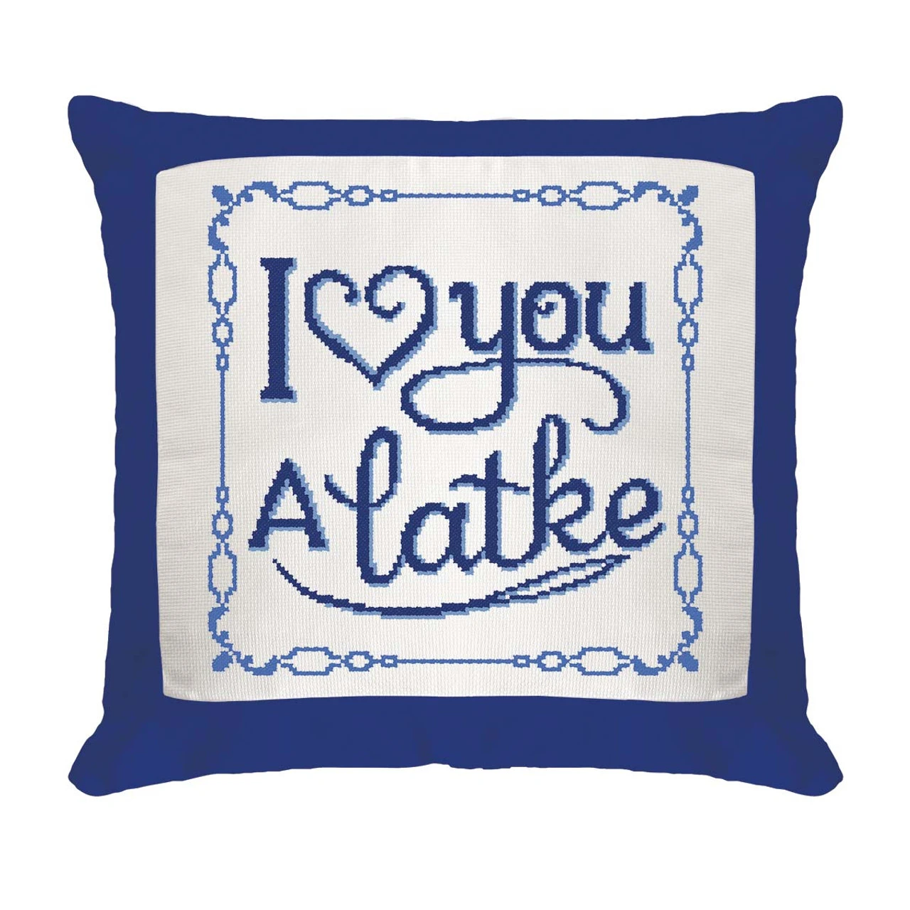 This Hanukkah counted cross-stitch pillow covers is stitched with cheeky saying “I love you a latke” stitched in blue with a blue filagree border around the typographical design. The playful pillow adds personality to your sitting area during Hanukkah or any day of the year! The design is stitched on a pre-finished white 14-ct. aida cloth pillow cover with a fabric border and zippered backing. The easy-to-see squares of aida cloth make it a great fabric choice for both beginning stitchers and those with more experience. This complete counted cross-stitch kit includes the pre-finished pillow cover, cotton floss, floss organizer, needle, and instructions. The finished pillow measures 16 x 16″ (41 x 41cm). Made in U.S.A. and imported.