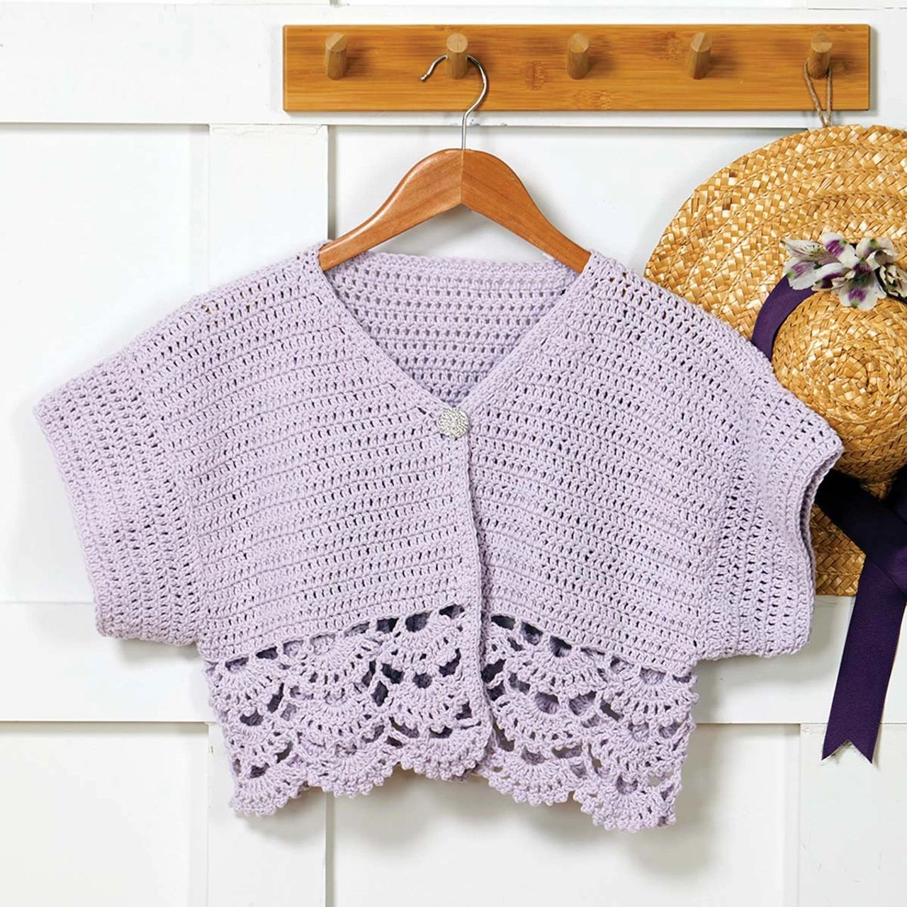 Embellished with a panel of lacy scallops, this cropped cardi in a soft purple shade of Herrschners Cottage Cotton yarn perfectly blends casual and fanciful. Pair this cardigan with a tank or dress for timeless summer fashions. Along with the yarn and easy crochet instructions, this cardigan comes with a zippered bag for storage. Available in sizes Small to 2X, this vest requires a US size G-6 (4mm) crochet hook to complete (not included). Imported.