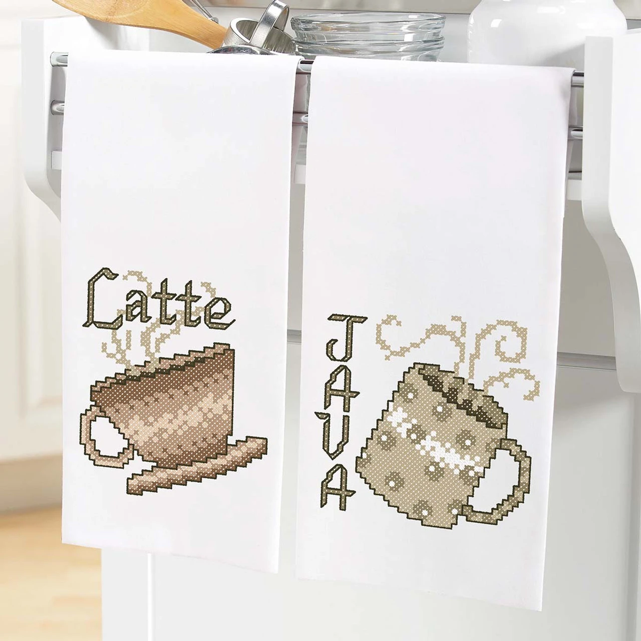 These coffeehouse-inspired towels are decorated with patterned coffee cups filled with your favorite morning brews and labeled with the words latte and java. The neutral brown tones and sophisticated imagery bring coffeehouse style to your kitchen. These cross-stitch towels are stamped for stitching on white polyester/cotton fabric with a perle edge. There are two towels in the set, and each towel is pre-finished and ready for stitching. Simply follow the easy-to-read chart and instructions to stitch the towels. Floss and needle are not included. Each towel measures 19 x 34″ (48 x 86cm). Made in U.S.A.