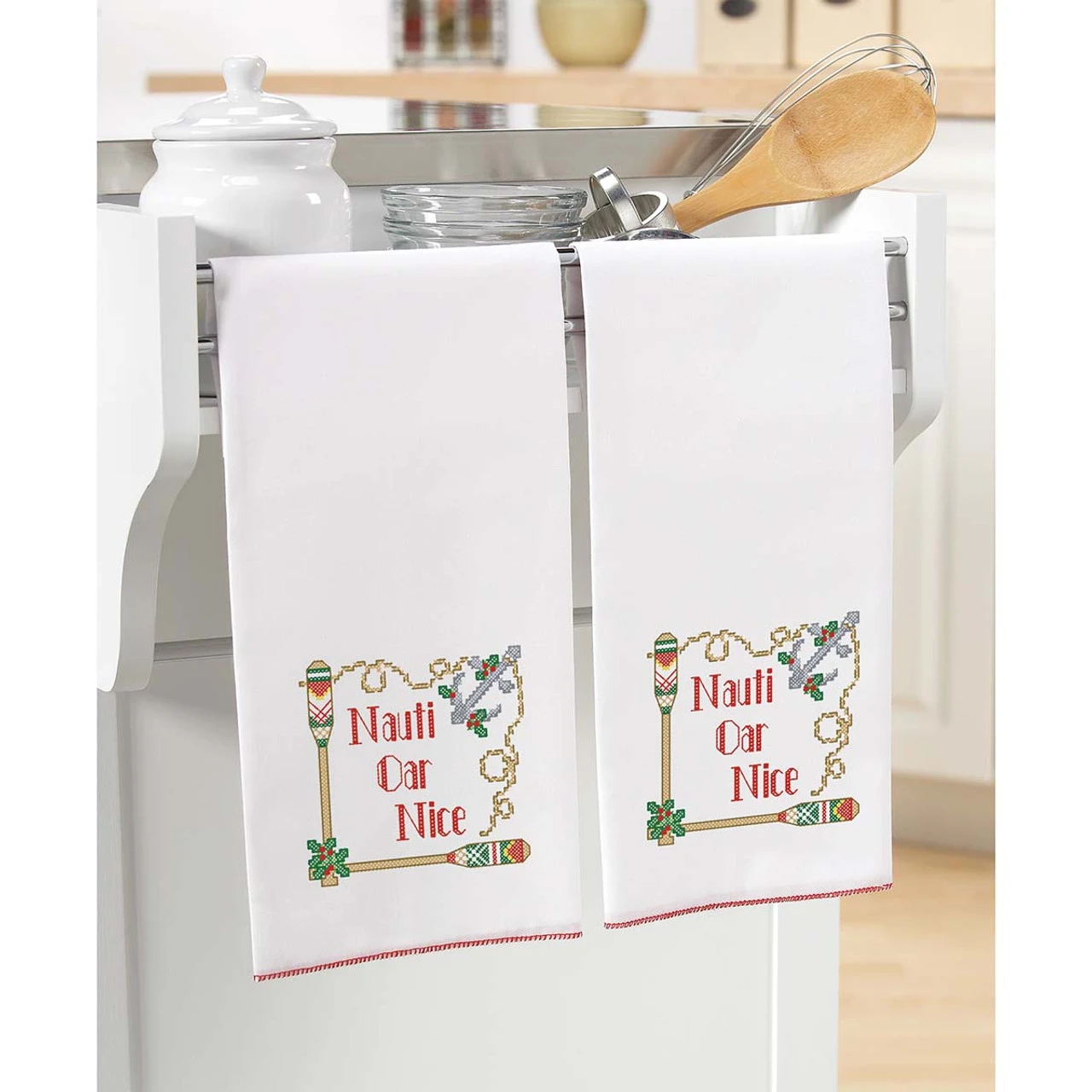 This cheeky pair of cross-stitch towels puts a nautical twist on Santa’s naughty or nice list by changing up the phrase to “Nauti Oar Nice.” Framed with a pair of oars, an anchor, and rope, this Christmas duo is perfect for a beach home. These cross-stitch towels are stamped for stitching on white polyester/cotton towels with a red perle edge. There are two towels in the set, and each towel is pre-finished and ready for stitching. Simply follow the easy-to-read chart and instructions to stitch the towels. Floss and needle are not included. Each towel measures 19 x 34″ (48 x 86cm). Imported.