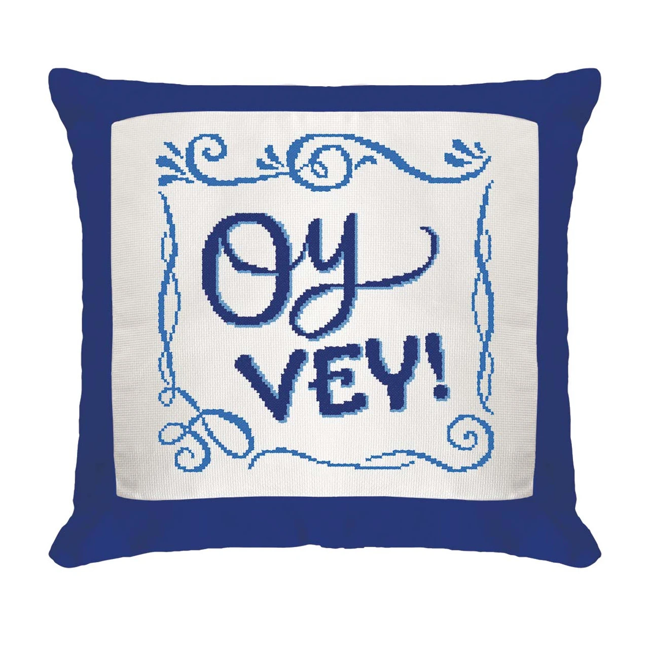 This Hanukkah counted cross-stitch pillow covers is stitched with cheeky saying “Oy vey!” stitched in blue with a blue filagree border around the typographical design. The playful pillow adds personality to your sitting area during Hanukkah or any day of the year! The design is stitched on a pre-finished white 14-ct. aida cloth pillow cover with a fabric border and zippered backing. The easy-to-see squares of aida cloth make it a great fabric choice for both beginning stitchers and those with more experience. This complete counted cross-stitch kit includes the pre-finished pillow cover, cotton floss, floss organizer, needle, and instructions. The finished pillow measures 16 x 16″ (41 x 41cm). Made in U.S.A. and imported.