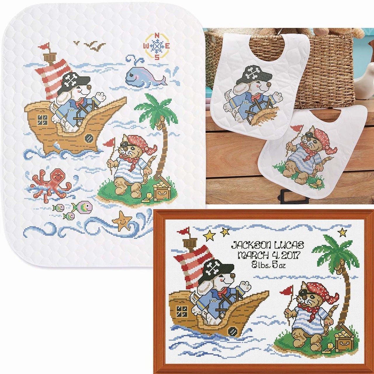 our little one will dream of swashbuckling adventures on the high seas with this imaginative design in his nursery. This bundled set helps you create a coordinated nursery with a matching baby quilt, pair of baby bibs, and a birth record featuring dogs and cats dressed up as pirates with tropical islands, a pirate ship, and ocean friends like whales, an octopus, and fish. The baby quilt and bibs are stamped for cross-stitch on pre-quilted white polyester/cotton fabric with a bound edge. The bibs have a hook and loop closure. As both are pre-finished and pre-quilted, there are no extra sewing or quilting skills needed. The counted cross-stitch birth record kit includes 14-ct. white aida cloth. All kits include cotton floss, floss organizer, and needle. Made in U.S.A. and imported.