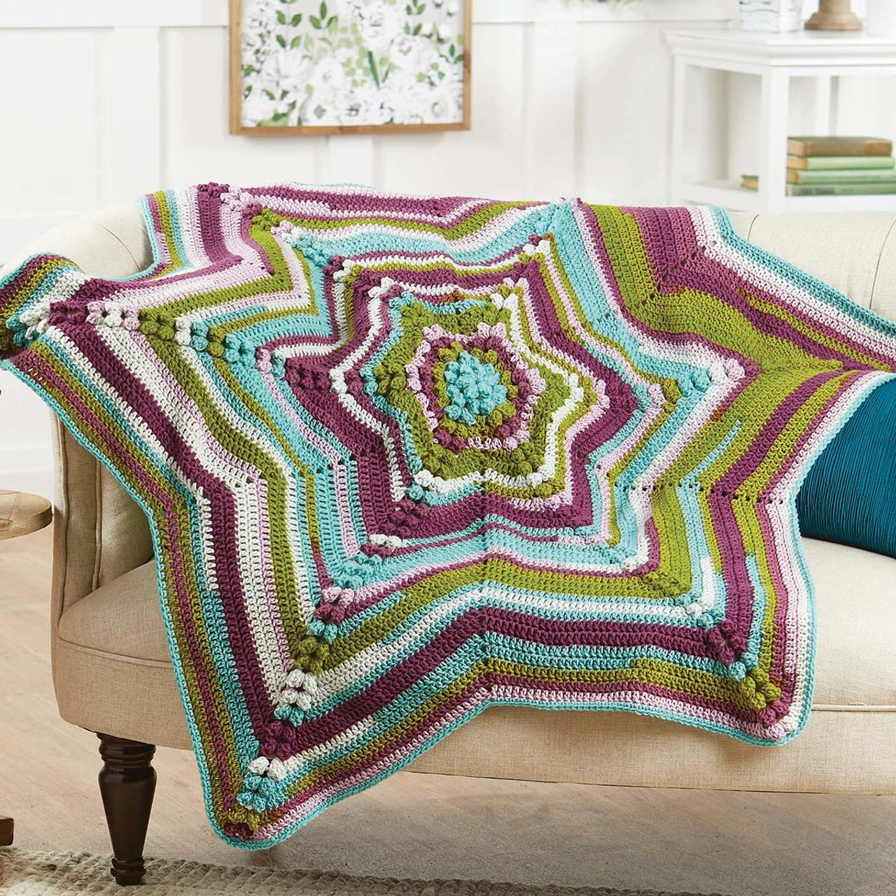 Curl up under a colorburst of self-striping Herrschners Worsted 8 Stripes yarn paired with coordinating solid shades of Herrschners Worsted 8 yarn. This easy crochet afghan pattern works a ripple pattern in the round to create a fun star shape accented with eyelets and chunky popcorn stitches that create a dimensional asterisk on the eye-catching design. Along with the yarn and easy crochet instructions, this afghan kit comes with a clear zippered storage bag, yarn needle, and a label for personalization. This 57″ (145cm) dia. design requires a US size J-10 (6mm) hook to complete (not included). Imported.