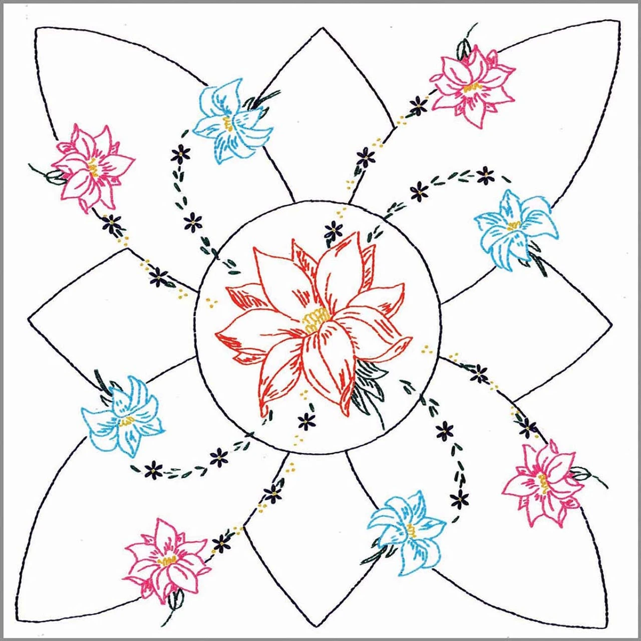 This floral quilt block design features beautiful pink and blue flowers in a swirling arrangement connected with petal-like backstitching. The designs are stamped for embroidery on white cotton/polyester fabric. Simply follow the easy-to-read chart and instructions to stitch the designs. The completed quilt blocks can be finished as a quilt but also are perfectly sized to make throw pillows. Floss, needle, and finishing fabrics are not included. Each quilt block measures 18 x 18″ (46 x 46cm). Imported.