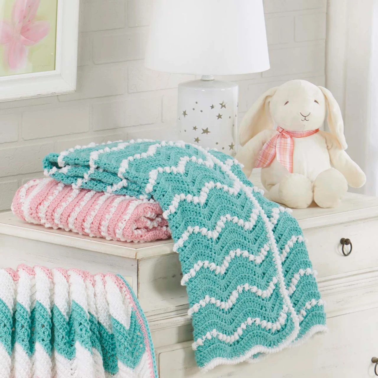 Brighten baby’s nursery with a classic ripple design in bold, modern colors. Kit includes Herrschners Worsted 8 Baby Yarn and easy crochet instructions to make all three blankets! 35 × 43″ (89 x 109cm) each. Imported.
