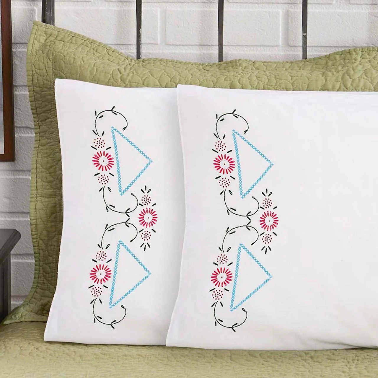 • These pre-finished pillowcases are ready for stitching with pink flowers with green vines around blue triangles.