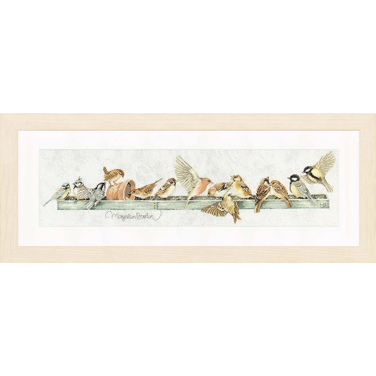 This spring counted cross-stitch design adapted from the artwork of Marjolein Bastin features a flock of songbirds perched on a long tray serving up tasty treats to the fathered friends as they gather for a morning chat. This design is stitched on ivory 27-ct. evenweave fabric. The fine weave of the fabric brings a high-quality appearance to finished projects with an exquisite level of detail. It is intended for stitchers with experience. This complete counted cross-stitch kit includes ivory 27-ct. evenweave fabric, cotton floss, needle, and instructions. The finished design measures 28 x 7″ (71 x 17.8cm). Imported from Europe.