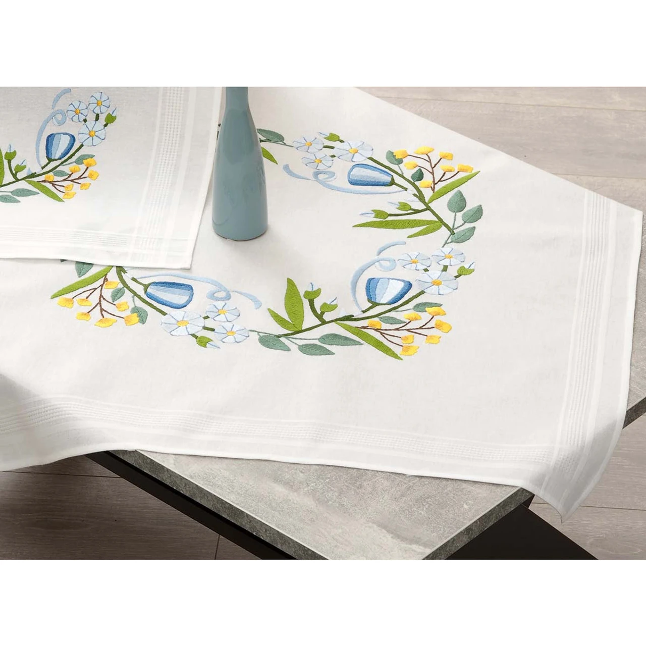 • This pre-finished table topper is ready for stitching with soft yellow and blue flowers with green leaves and blue swirls.
