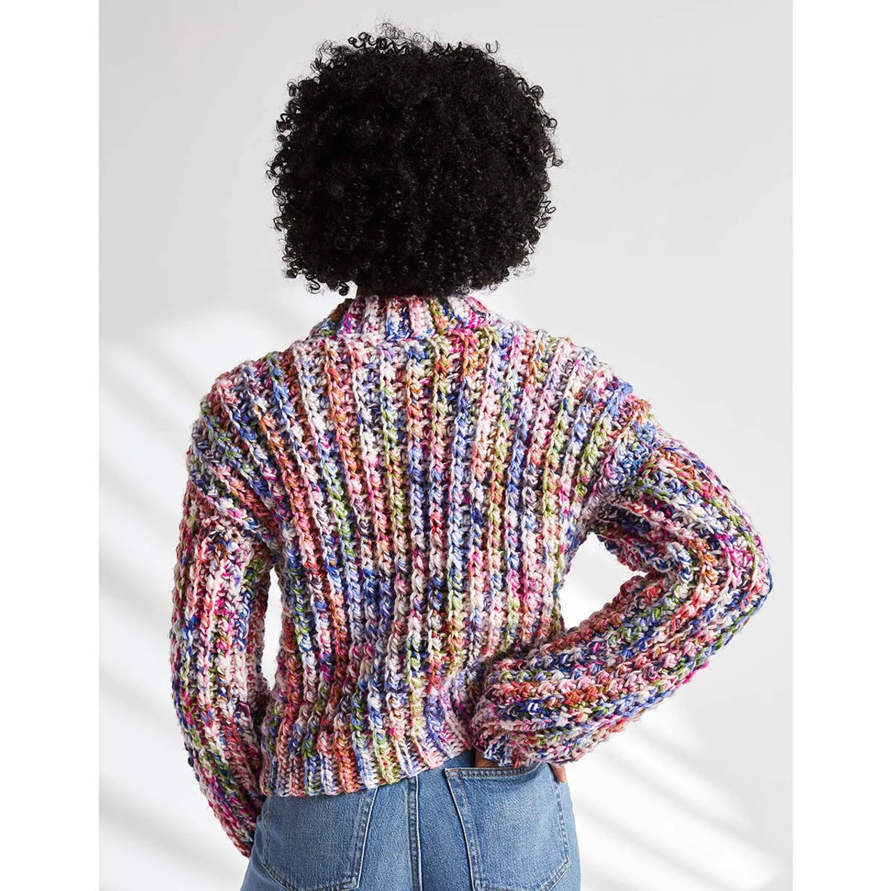 Chic, cozy, and colorful—this chunky crochet sweater has it all! This intermediate crochet pullover is worked in pieces then seamed together. The design features a crinkle rib pattern worked in in Premier Serenity Chunky Candy yarn, a chunky weight yarn that stitches up quickly with a multicolor dappled look. This pullover kit includes the yarn and intermediate crochet instructions. Available in sizes Extra Small through 5X, this design requires a US size L-11 (8mm) hook to complete (not included). Imported.