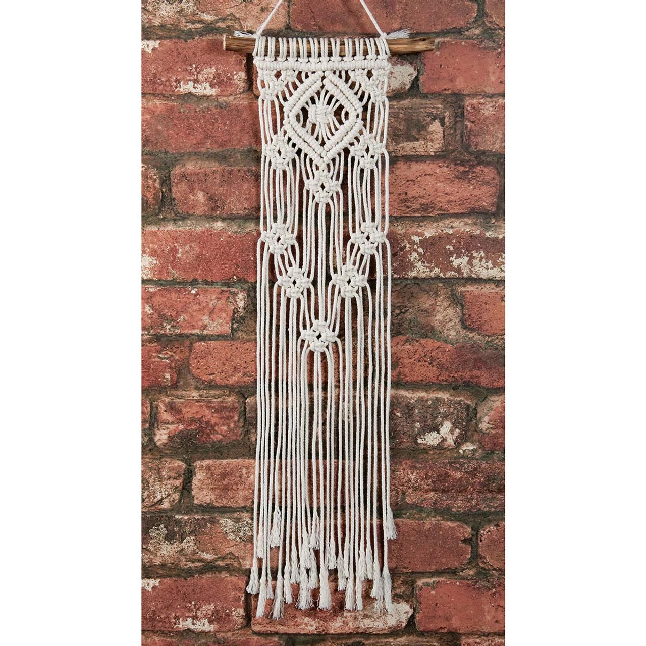 This trendy macramé wall hanging features a simple knotting pattern of diamonds arranged in a geometric pattern. Displayed on a natural wood hanging branch, this 5 x 22″ (12.7 x 56cm) macrame wall hanging is finished with long fringe that brings a boho-chic flair to any room of your home. This macramé kit includes natural cotton cord, natural wood hanging branch, and complete step-by-step instructions to create the tapestry wall hanging as shown. Imported.