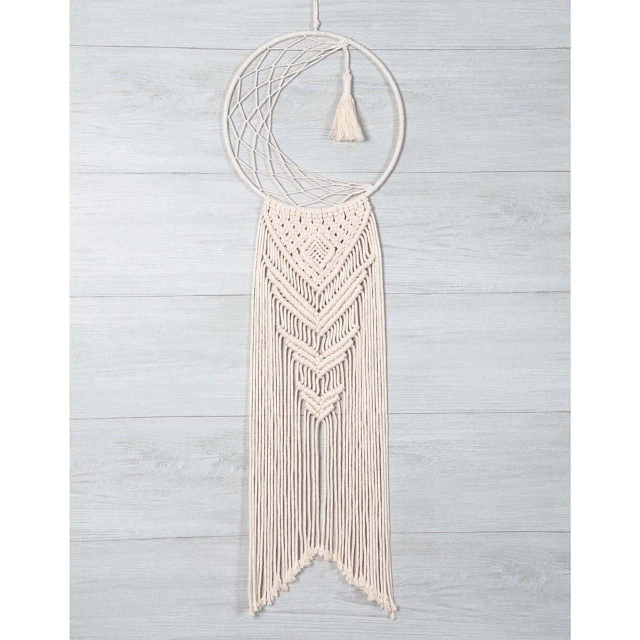 • This wall hanging design features a crescent moon with a tassel inside a wrapped hoop with a knotted design and long fringe hanging below.