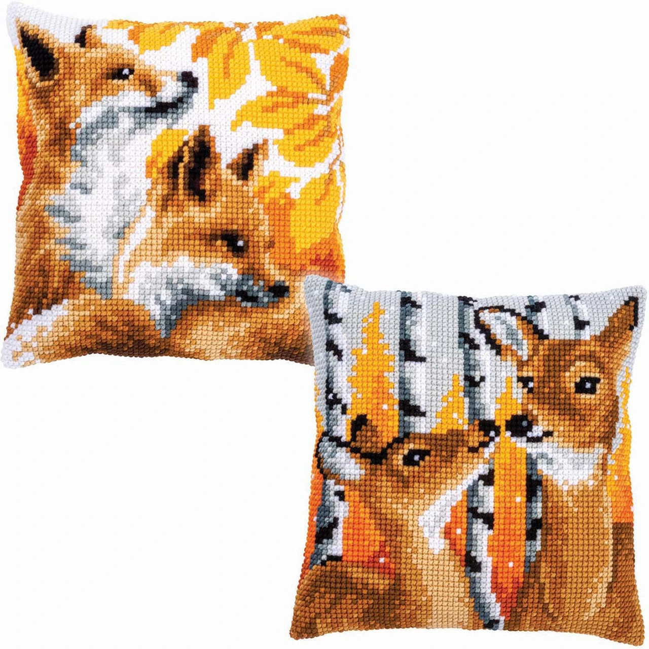 • Designs features two deer in front of birch trees with orange and yellow fall trees in the background and two foxes snuggled up together surrounded by autumn leaves.
