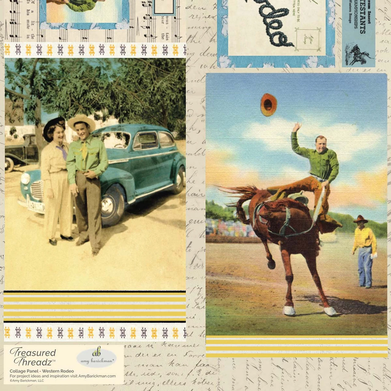 • The design features rodeo-inspired images of cowboys, advertisements, and musical scores.